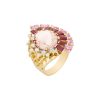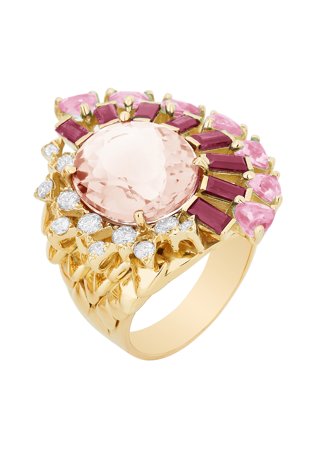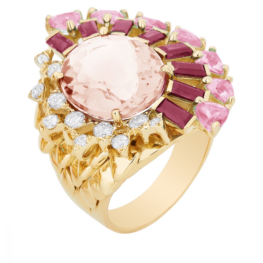 Ouro amarelo 18k, Morganita (10ct), Rubis (1ct), Turmalinas Rosas (2ct) e Brilhantes (0,4ct) Medidas: Peso: 16,4g Tamanho: 27x24mm