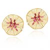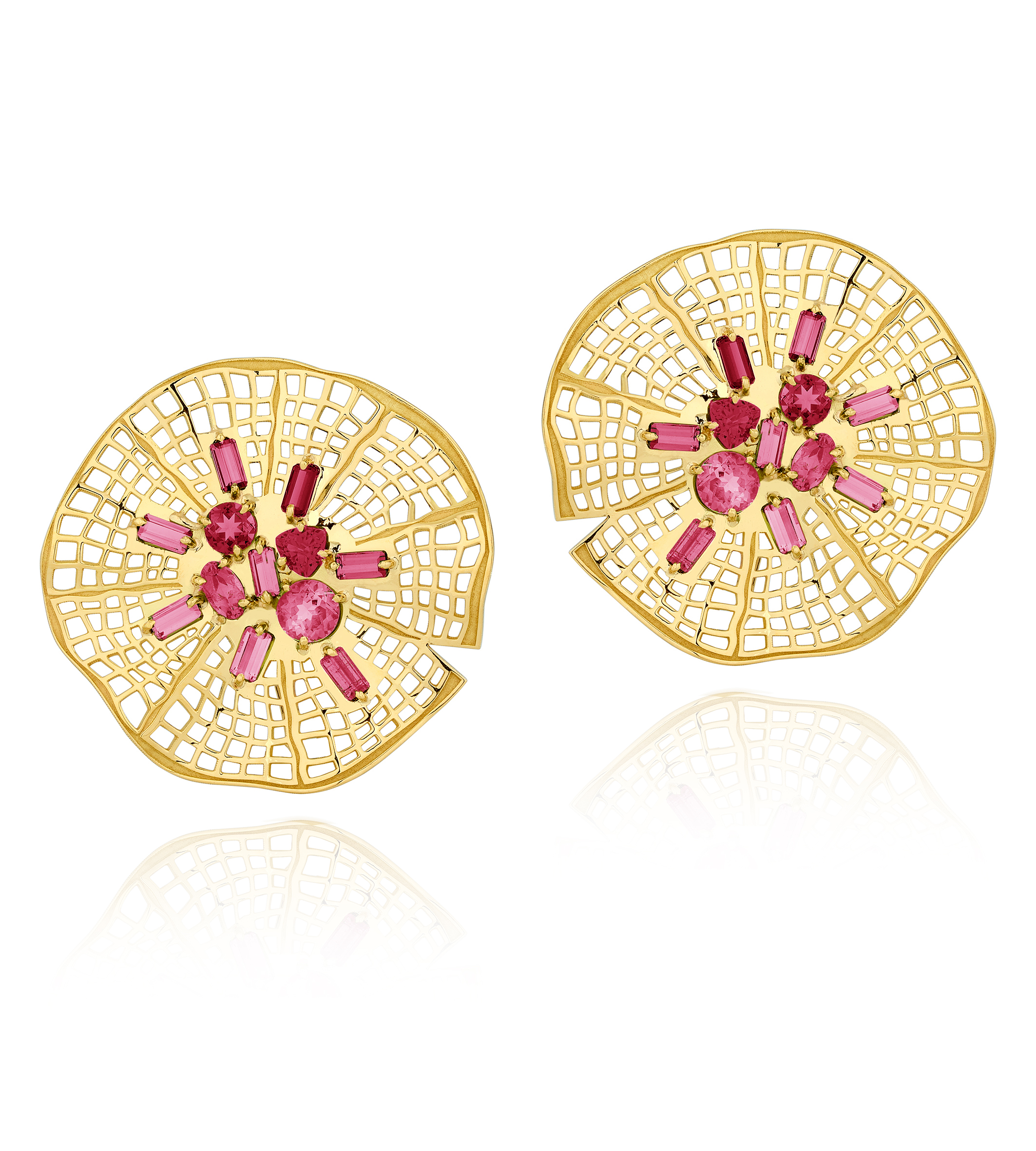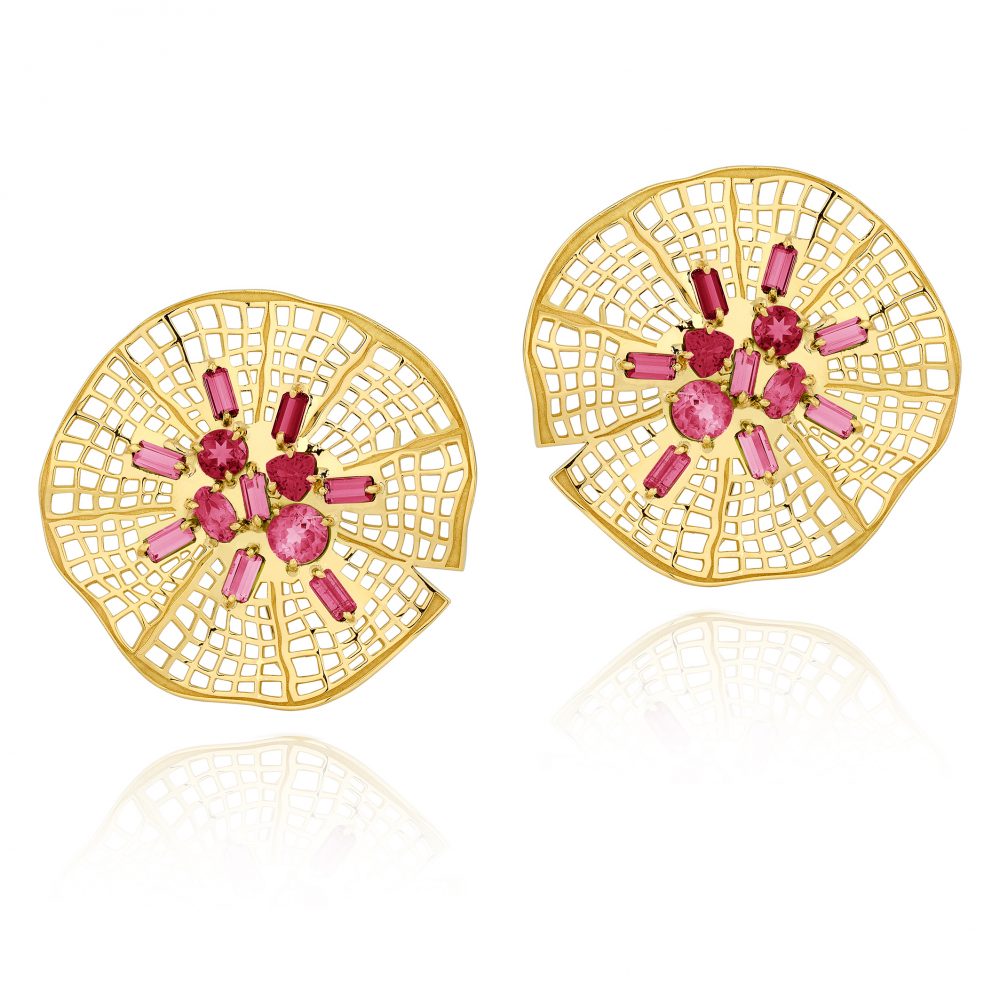 Ouro amarelo 18k, Rubis (2,8ct) e Turmalinas Rosas (2,7ct) Peso: 13g Medidas: 35x35mm