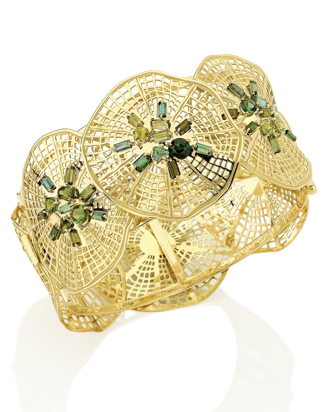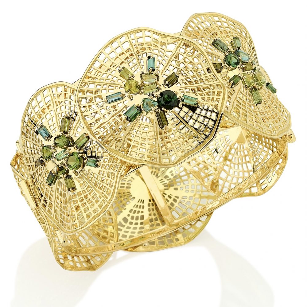 Ouro amarelo 18k e Turmalinas Verdes (7,55ct) Peso: 54,5g Medida: 65×60 mm