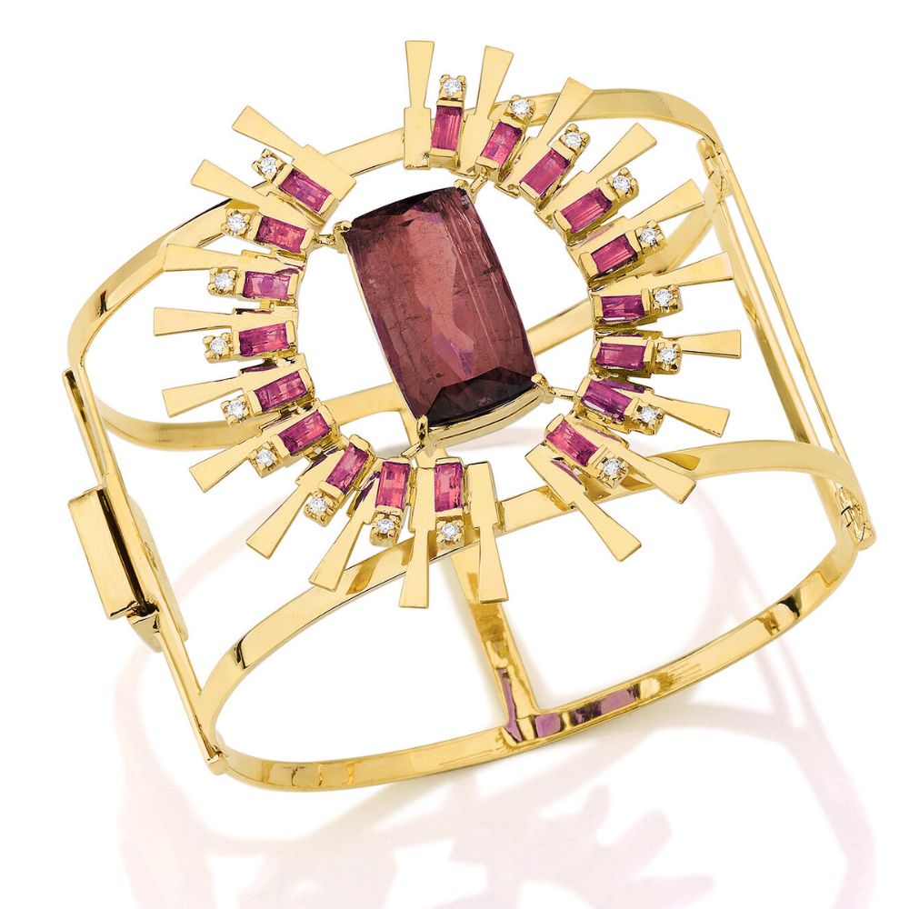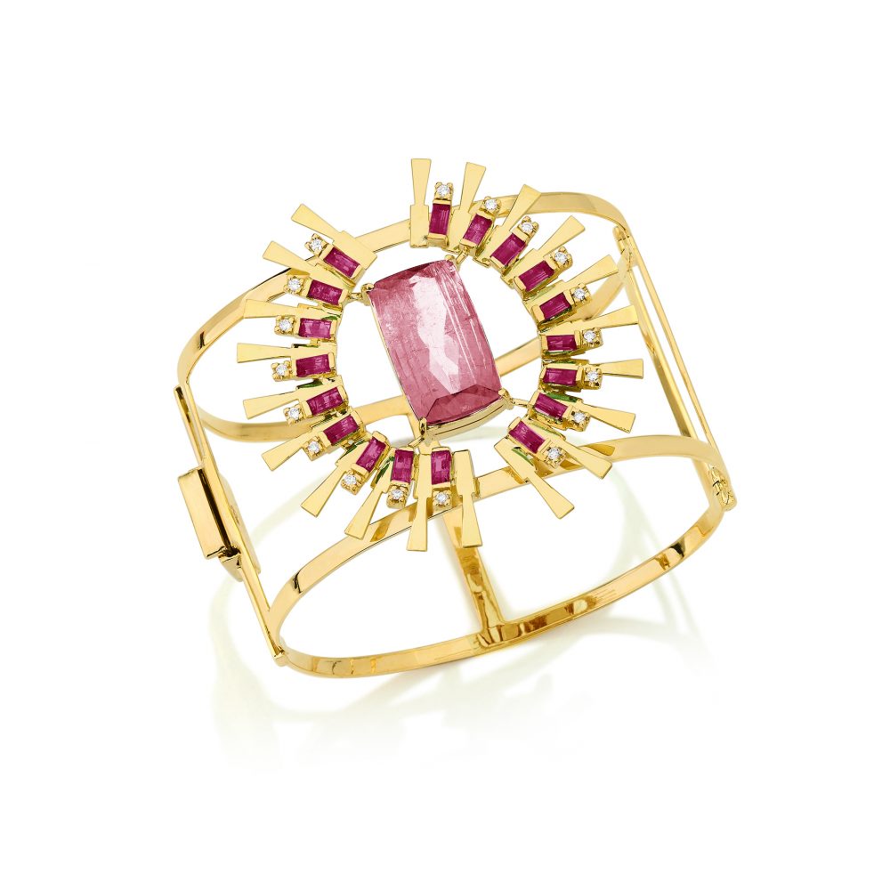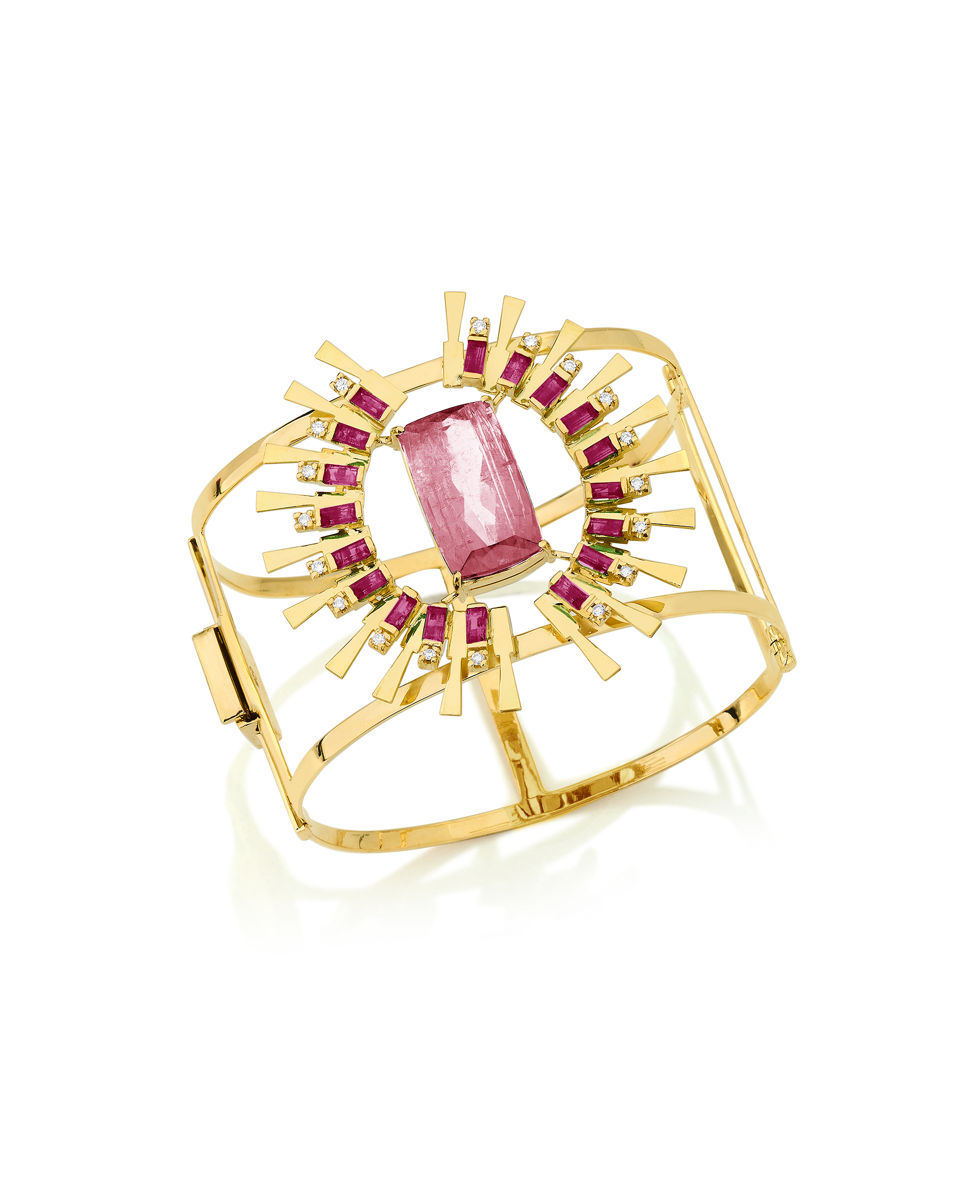 Ouro amarelo 18k Rubis (2,5ct) e Turmalina Rosa (14ct) Peso: 39,5g Medida: 60×60 mm